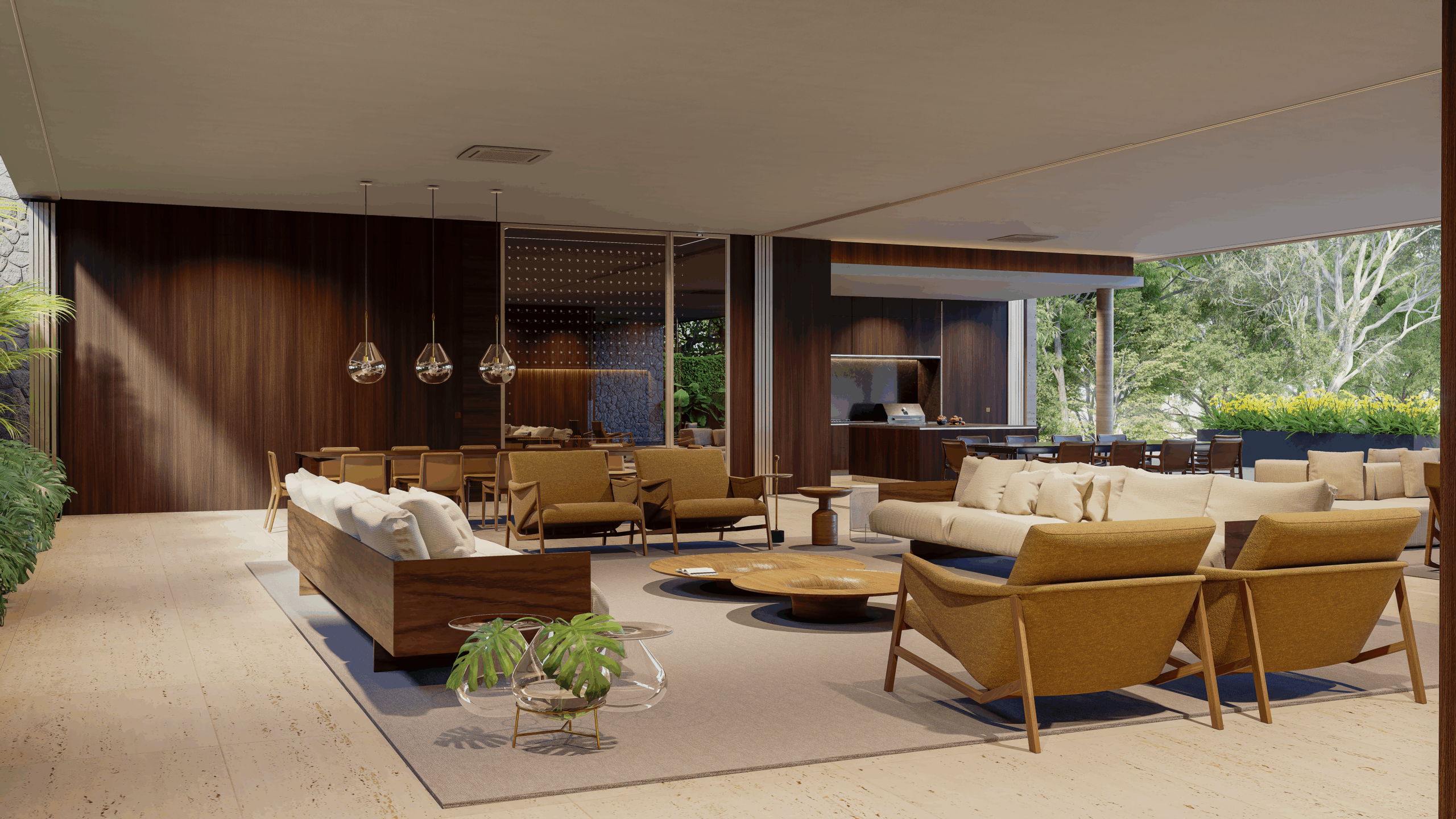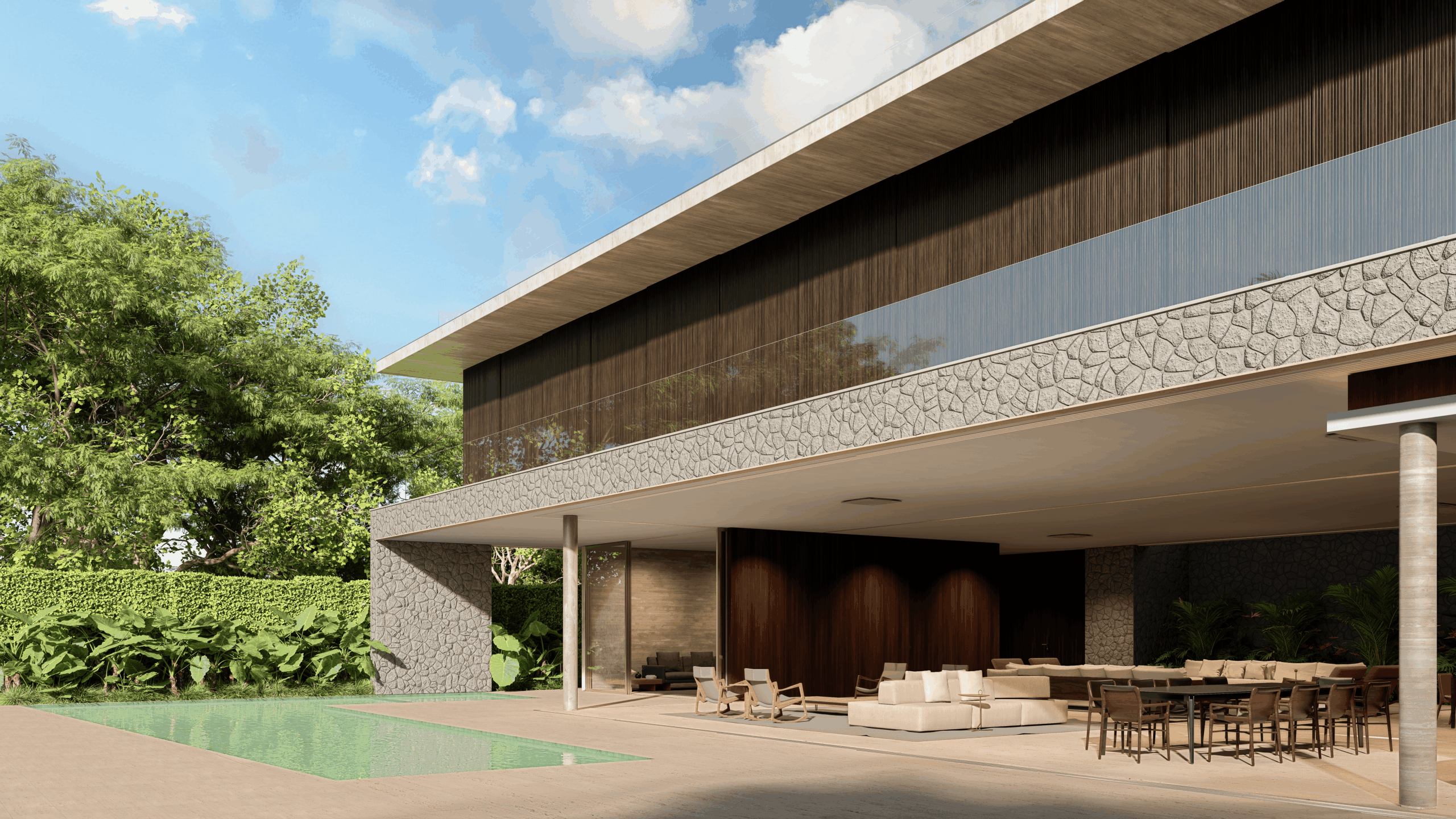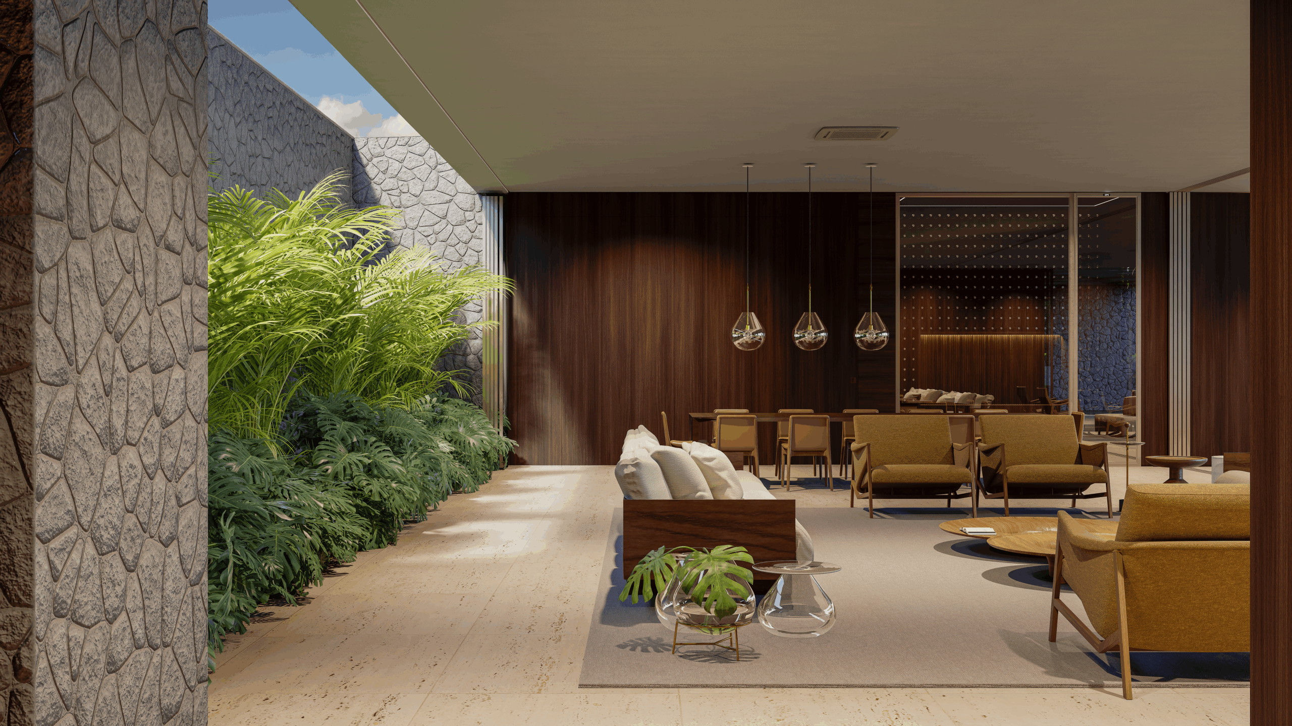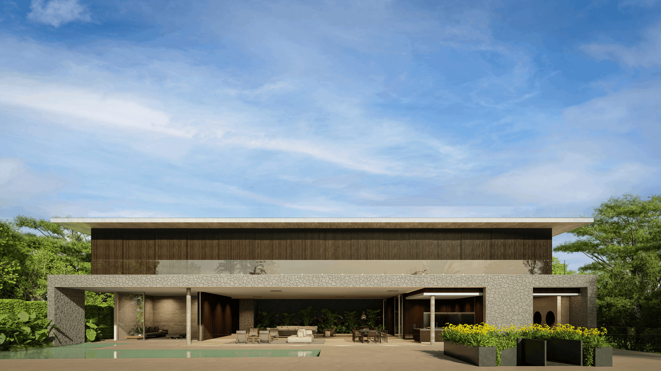 2 – Térreo – hall, lavabo, escritório com banheiro, adega, living, jardim de inverno, home theater, sala de jantar, cozinha, louceiro, despensa, varanda gourmet, sala de almoço, piscina com prainha e hidromassagem, banheiros externos, sala de automação e elevador.
